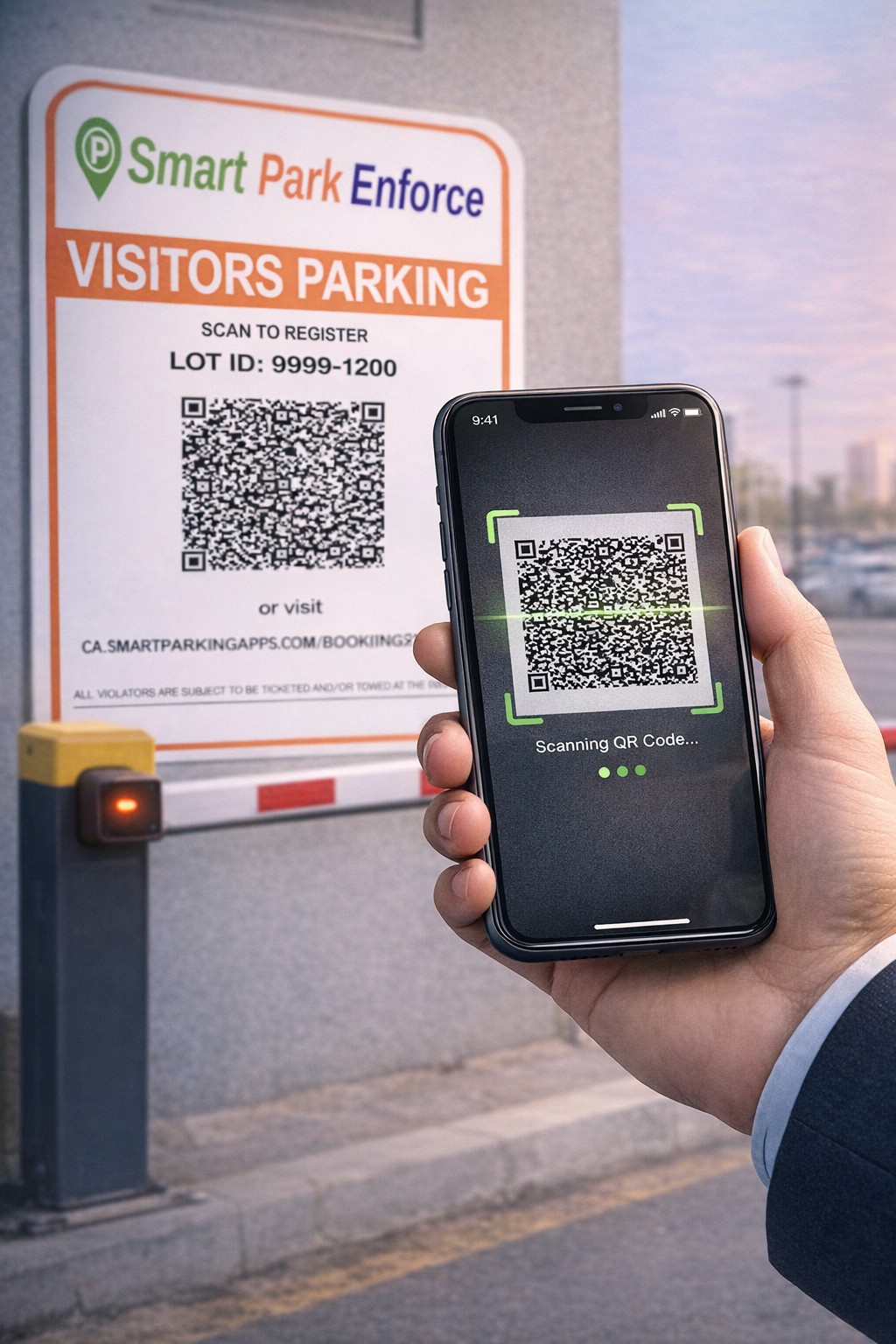 Pull up, find the QR code on the sign or barrier, scan with your camera. No app, no account. Gate opens in seconds.